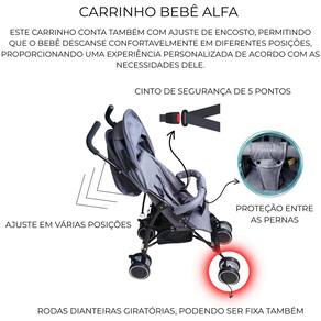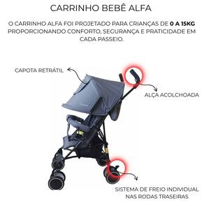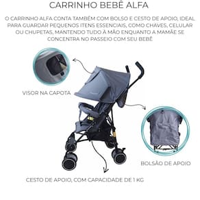 Carrinho de bebê alfa passear até 15 kg compacto fechamento sombrinha cinza O carrinho alfa foi projetado para crianças de 0 a 15kg proporcionando conforto, segurança e praticidade em cada passeio. A capota com visor permite que a mamãe mantenha contato visual com seu bebê enquanto o protege dos raios solares, garantindo passeios mais agradáveis em qualquer condição de luminosidade. O cinto de segurança de 5 pontos, oferece uma proteção extra, mantendo o bebê seguro no carrinho durante todo o passeio. O carrinho alfa conta também com bolso de apoio, ideal para guardar pequenos itens essenciais, como chaves, celular ou chupetas, mantendo tudo à mão enquanto a mamãe se concentra no passeio com seu bebê. Este carrinho conta também com ajuste de encosto, permitindo que o bebê descanse confortavelmente em diferentes posições, proporcionando uma experiência personalizada de acordo com as necessidades dele. O freio é de acionamento individual nas rodas traseiras e rodas dianteiras podem ser giratórias ou fixas, facilitando a condução do carrinho, garantindo estabilidade e controle mesmo em terrenos mais irregulares. O sistema de fechamento do carrinho alfa é do tipo guarda-chuva. Características: - cor: cinza - assento com ajuste em várias posições - cinto de segurança de 5 pontos - cesto com capacidade de 1kg - capota retrátil - as rodas dianteiras podem ter movimento livre ou fixo - freio individual das rodas traseiras - sistema de fechamento tipo guarda-chuva - medida do carrinho aberto: 104 x 60 x 93cm axlxp - de 12 meses direto com o fabricante - produto certificado nbr 14400 - registro do produto no inmetro - nº 012127/2023 Homologação Inmetro: CE-BRI/ICEPEX-N 01398-64-9 Marca: Não Informado