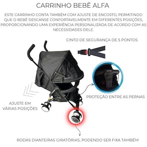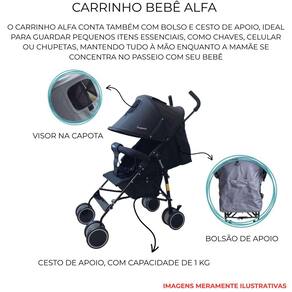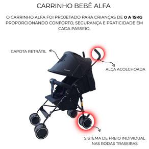 Carrinho de bebê alfa passear até 15 kg compacto fechamento sombrinha preto 7908488104353 O carrinho alfa foi projetado para crianças de 0 a 15kg proporcionando conforto, segurança e praticidade em cada passeio. A capota com visor permite que a mamãe mantenha contato visual com seu bebê enquanto o protege dos raios solares, garantindo passeios mais agradáveis em qualquer condição de luminosidade. O cinto de segurança de 5 pontos, oferece uma proteção extra, mantendo o bebê seguro no carrinho durante todo o passeio. O carrinho alfa conta também com bolso de apoio, ideal para guardar pequenos itens essenciais, como chaves, celular ou chupetas, mantendo tudo à mão enquanto a mamãe se concentra no passeio com seu bebê. Este carrinho conta também com ajuste de encosto, permitindo que o bebê descanse confortavelmente em diferentes posições, proporcionando uma experiência personalizada de acordo com as necessidades dele. O freio é de acionamento individual nas rodas traseiras e rodas dianteiras podem ser giratórias ou fixas, facilitando a condução do carrinho, garantindo estabilidade e controle mesmo em terrenos mais irregulares. O sistema de fechamento do carrinho alfa é do tipo guarda-chuva. Características: - cor: preto - assento com ajuste em várias posições - cinto de segurança de 5 pontos - cesto com capacidade de 1kg - capota retrátil - as rodas dianteiras podem ter movimento livre ou fixo - freio individual das rodas traseiras - sistema de fechamento tipo guarda-chuva - medida do carrinho aberto: 104 x 60 x 93cm axlxp - de 12 meses direto com o fabricante - produto certificado nbr 14400 - registro do produto no inmetro - nº 012127/2023 Homologação Inmetro: CE-BRI/ICEPEX-N 01398-64-9 Marca: Não Informado