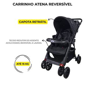 Carrinho de bebê atena reversível até 15 kg capota retrátil porta copos preto Carrinho atena reversível Desenvolvido para crianças de 0 a 15kg, o carrinho de bebê atena reversível feito em tecido oxford apresenta uma estrutura robusta de aço, garantindo segurança e durabilidade para os pequenos. Seu assento ajustável em 3 posições proporcionando conforto personalizado em qualquer situação. Equipado com cinto de segurança de 5 pontos, os pais podem passear tranquilamente. Além disso, o fechamento deste carrinho é fácil e prático usando apenas uma mão, o que torna o transporte e armazenamento uma tarefa simples e rápida. A capota retrátil oferece proteção contra o sol e outros elementos, enquanto o eixo traseiro e as rodas dianteiras removíveis facilitam ainda mais o transporte e armazenamento do carrinho. O visor na cabeceira do assento permite aos pais manter contato visual com o bebê em todos os momentos, proporcionando tranquilidade. E o tecido acolchoado removível e lavável garante praticidade na limpeza e manutenção do carrinho. Para maior comodidade, o carrinho de bebê atena reversível conta com porta copos duplo para o bebê e na alça para a mamãe, garantindo praticidade durante os passeios. E para fechar com chave de ouro, a alça reversível oferece versatilidade para os pais. O carrinho atena reversível conta com um amplo cesto porta objeto com capacidade de até 5kg e é compatível com o bebê conforto nina. Características: Assento com ajuste em 3 posições Cinto de segurança de 5 pontos Compatível com bebê conforto nina vendido separadamente Sistema de acionamento de freio único nas rodas traseiras Cesto com capacidade de 5kg Porta copos para criança Porta copos na alça Fechamento com uma mão Capota retrátil Eixo traseiro e rodas dianteiras removíveis Tecido de assento acolchoado, removível e lavável. Homologação Inmetro: APTA-BRI-0005/22-12 Marca: Não Informado Ean: 7908488103707
