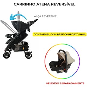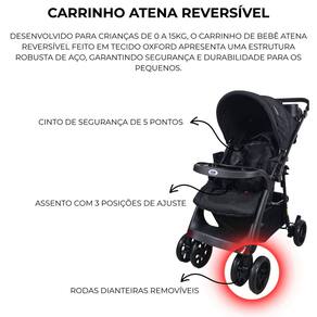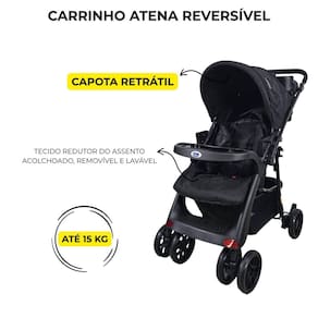 Carrinho de bebê atena reversível até 15 kg capota retrátil porta copos preto Carrinho atena reversível Desenvolvido para crianças de 0 a 15kg, o carrinho de bebê atena reversível feito em tecido oxford apresenta uma estrutura robusta de aço, garantindo segurança e durabilidade para os pequenos. Seu assento ajustável em 3 posições proporcionando conforto personalizado em qualquer situação. Equipado com cinto de segurança de 5 pontos, os pais podem passear tranquilamente. Além disso, o fechamento deste carrinho é fácil e prático usando apenas uma mão, o que torna o transporte e armazenamento uma tarefa simples e rápida. A capota retrátil oferece proteção contra o sol e outros elementos, enquanto o eixo traseiro e as rodas dianteiras removíveis facilitam ainda mais o transporte e armazenamento do carrinho. O visor na cabeceira do assento permite aos pais manter contato visual com o bebê em todos os momentos, proporcionando tranquilidade. E o tecido acolchoado removível e lavável garante praticidade na limpeza e manutenção do carrinho. Para maior comodidade, o carrinho de bebê atena reversível conta com porta copos duplo para o bebê e na alça para a mamãe, garantindo praticidade durante os passeios. E para fechar com chave de ouro, a alça reversível oferece versatilidade para os pais. O carrinho atena reversível conta com um amplo cesto porta objeto com capacidade de até 5kg e é compatível com o bebê conforto nina. Características: Assento com ajuste em 3 posições Cinto de segurança de 5 pontos Compatível com bebê conforto nina vendido separadamente Sistema de acionamento de freio único nas rodas traseiras Cesto com capacidade de 5kg Porta copos para criança Porta copos na alça Fechamento com uma mão Capota retrátil Eixo traseiro e rodas dianteiras removíveis Tecido de assento acolchoado, removível e lavável. Homologação Inmetro: APTA-BRI-0005/22-12 Marca: Não Informado Ean: 7908488103707