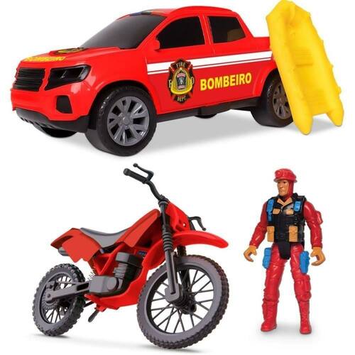 Bombeiro kit resgate A linha bombeiro vem com uma moto, uma pickup e um bombeiro prontos para o resgate. A moto possui suspensão traseira para tornar ainda mais real a brincadeira. A pick up vem com um super bote. Recomendado para crianças a partir de 3 anos de idade. - dimensões aproximadas da pick up axlxc : 9cmx9cmx20cm; - dimensões aproximadas da moto axlxc : 9cmx7,5cmx15cm; - dimensões aproximadas do bonequinho altura : 11cm;