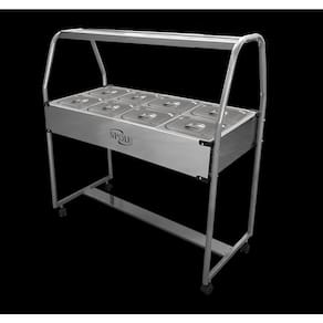 A função do Buffet térmico SPOLU é manter os alimentos servidos em suas cubas quentes enquanto em exposição. Possui cubas fabricadas em aço inox 201, tanque, tampas e moldura externa em aço inox 430 e estrutura de sustentação tubular. Sua resistência blindada é confeccionada em aço inox e controlada por um termostato com escala de 30ºC a 120ºC. Possui uma lâmpada piloto em seu painel indicando a função liga/desliga do termostato. Para facilitar a movimentação e o deslocamento a estrutura tubular é dotada de rodízios giratórios. Características Técnicas do Carrinho Buffet Térmico Self Service Inox 8 Cubas Quentes 6lts 220v Aço Inox Spolu: - Marca: SPOLU - Modelo: 8 CUBAS - Cubas fabricadas em aço inox 201, tanque, tampas e moldura externa em aço inox 430 e estrutura de sustentação tubular. - Resistência blindada confeccionada em aço inox e controlada por termostato com escala de 30ºC a 120ºC. - Possui uma lâmpada piloto em seu painel indicando a função liga/desliga do termostato. - Para facilitar a movimentação e o deslocamento a estrutura tubular é dotada de rodízios giratórios. - Capacidade da Cuba: 6 Litros - 1/2 - Potência: 2.650W - Frequência: 60 Hz Medidas e Consumo do Carrinho Buffet Térmico Self Service Inox 8 Cubas Quentes 6lts 220v Aço Inox Spolu: - Altura: 135cm - Altura até a mesa: 85cm - Peso: 22kg. - Consumo: 1,9 Kw/h