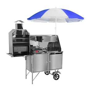 Carrinho de Churrasco Cachorro Quente e Lanche Inox com Guarda Sol e Rodas Maciças