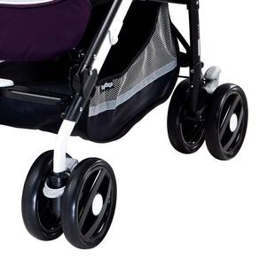 Vem cinto de segurança de cinco pontos, encosto reclinável em quatro posições, apoio para as pernas reclinável em três posições, suspensão nas quatro rodas, porta-bebidas, protetor frontal articulado e muito mais.