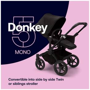 O Donkey 5 Mono pode acomodar uma única criança desde o nascimento e se transforma em um carrinho lado a lado para atender às necessidades de sua família em crescimento, com o Duo Extension Set vendido separadamente ou Twin Duo Extension Set e Twin Bassinet. O berço possui um design elegante com novo sistema de ventilação que mantém seu bebê confortável e regulará sua temperatura. A malha transparente e macia permite que seu bebê descubra o mundo ou seus irmãos nos modos Duo e Twin.