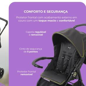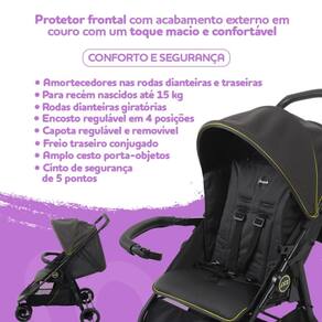 Características do Produto: Uso desde o nascimento até 15 kg: ideal para recém-nascidos e bebês em fase de crescimento. Protetor frontal com acabamento em couro sintético: removível, com toque macio e confortável para o bebê. Encosto reclinável em 4 posições: proporciona diferentes níveis de inclinação para descanso ou passeio. Capota regulável e removível: protege contra sol e vento. Amortecedores nas rodas dianteiras e traseiras: garantem passeios mais suaves, mesmo em superfícies irregulares. Rodas dianteiras giratórias: mais agilidade e facilidade nas manobras. Freio traseiro conjugado: segurança garantida com simples acionamento. Cinto de segurança de 5 pontos: mantém o bebê bem posicionado e protegido. Amplo cesto porta-objetos: comporta até 2 kg, ideal para levar acessórios e itens do bebê. Trava para fechamento: facilita o transporte e o armazenamento do carrinho. Compatível com bebê conforto Materna e Materna Lounge (vendidos separadamente). Compatível com o Ninho Pramette (vendido separadamente).