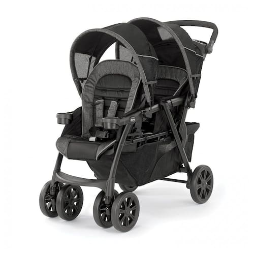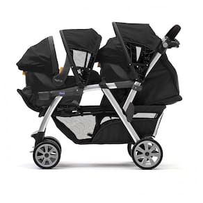Aceita 2 assentos de carro infantis Fit ou Fit2 com chave não é necessário adaptador 2 assentos de carrinho padrão com encosto reclinável e dosséis independentes A dobra autônoma pode ser ativada com uma mão Barra de braço e porta copos intercambiáveis para crianças Alça acolchoada de 3 posições e bandeja dos pais com 2 suportes de copo Dimensões dobradas 121 x 59 x 41 centímetros Marca: Não Informado