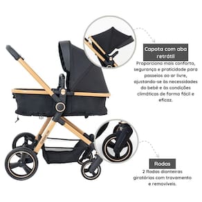 O carrinho combina modernidade e praticidade em um design leve e compacto. Seu tecido, com proteção UV50+ e resistência à água, garante conforto e segurança, mesmo em condições climáticas adversas. Além disso, o fechamento fácil, aliado ao cesto moisés dobrável, oferece funcionalidade e conveniência para o dia a dia dos pais.