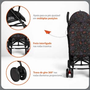 Características: Fechamento compacto e rápido: Fechamento estilo guarda-chuva, leve e fácil de transportar, com alça para levar a qualquer lugar. Assento reclinável: Três posições de inclinação, incluindo o modo berço, ajustáveis com uma mão. Capota ampla e extensível: Com visor, aba de sol e bolso porta-objetos, protege o bebê do sol e do vento. Apoio de pés ajustável: Possui cinco ajustes de altura, ideal para acompanhar o crescimento do bebê. Rodas duplas com travas: Estabilidade e controle total, com trava de giro 360 nas rodas dianteiras e freio interligado nas traseiras. Cinto de segurança de 5 pontos: Ajustável em altura e largura, com protetores acolchoados para máxima segurança. Cesto porta-objetos: Capacidade para até 3 kg, perfeito para carregar itens essenciais.
