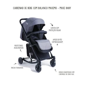 Carrinho De Bebê Passeio Vira Balanço Maximo Preto Maxi Baby O Carrinho de Bebê Passeio Vira Balanço Maximo Preto é a opção perfeita para proporcionar conforto e segurança aos pequenos durante os passeios. Com design inovador e exclusivo, o carrinho da Maxi Baby possui uma série de funcionalidades que tornam a experiência de passear com o bebê ainda mais prática e confortável. Com uma estrutura leve em alumínio, o carrinho é fácil de transportar e de manusear. Além disso, conta com acabamento moderno e atual, que garante durabilidade e resistência ao produto. A manopla confortável oferece fácil aderência, permitindo um controle preciso durante o passeio. A ampla capota ajustável possui proteção solar UV50+ e visor, proporcionando uma proteção completa contra os raios solares. O assento reclinável em 2 posições permite que o bebê fique mais deitado, garantindo um soninho tranquilo durante o passeio. O apoio de pés ajustável proporciona maior conforto para os maiorzinhos, enquanto o cinto de segurança de 5 pontos possui ajuste de largura e 3 posições de altura, garantindo a segurança do bebê em qualquer fase de seu crescimento. Com um cesto espaçoso, o carrinho oferece espaço para armazenar os itens essenciais do bebê durante o passeio. As rodas traseiras possuem freio centralizado, enquanto as rodas dianteiras possuem controle de giro 360, proporcionando muito mais conforto tanto para o bebê quanto para quem está dirigindo o carrinho. O fechamento rápido com apenas uma mão torna o carrinho ainda mais prático e funcional. Além disso, o carrinho possui a função de cadeira de balanço, basta ajustar o encosto na posição vertical e mover as rodas para cima conforme mencionado no manual. Nessa posição, a criança ficará mais sentada e poderá aproveitar o balanço de forma segura. Outra função do carrinho é a de berço, basta ajustar o encosto na posição mais deitada e ajustar o apoio de pés para proporcionar um balanço tranquilo e confortável para ninar o seu bebê. O Carrinho de Bebê Passeio Vira Balanço Maximo Preto Maxi Baby possui certificação pelo INMETRO, garantindo mais segurança aos pequenos e tranquilidade para os pais. Principais características: - Idade recomendada: de 0 meses a 15 kg - Estrutura leve de alumínio - Assento reclinável em 2 posições - Capota retrátil com visor - Rodas dianteiras com controle de giro 360 - Manopla confortável de fácil aderência - Apoio para os pés ajustável - Barra frontal para maior segurança - Cinto de segurança 5 pontos com ajuste de altura e largura - Cesto espaçoso e de fácil acesso - Freios traseiros para maior segurança - Fechamento rápido com uma mão - Aprovado pelo INMETRO Especificações técnicas: - Conteúdo da embalagem: 1 carrinho, 1 manual de instrução - Composição/material: nylon, alumínio, PP, PA, PU - Dimensões A x L x P : 99 x 54 x 68 cm - Peso do produto: 8,5 kg - : 90 dias contra defeito de fabricação pelo fabricante - Certificação: 002849/2023 - Código do fabricante: 21580 - EAN: 7899403215806 - Marca: Maxi Baby Imagens meramente ilustrativas, as cores e estampas podem variar de acordo com o lote do fabricante. Homologação INMETRO: CE-BRI/IQB 001187 52303/18-021 1. O carrinho vem com manual de instrução? Sim, o carrinho acompanha um manual de instrução para facilitar a montagem e utilização do produto. 2. Qual a idade recomendada para utilizar o carrinho? O carrinho é recomendado para bebês a partir de 0 meses