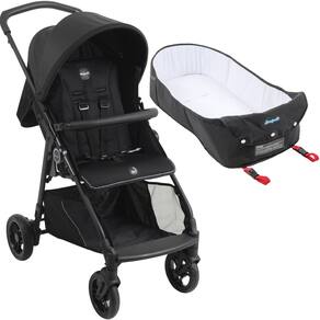 O modelo possui encosto reclinável em quatro posições, capota regulável e removível, cinto de segurança de cinco pontos, protetor frontal removível, rodas dianteiras giratórias, freio traseiro conjugado e cesto porta-objetos.
