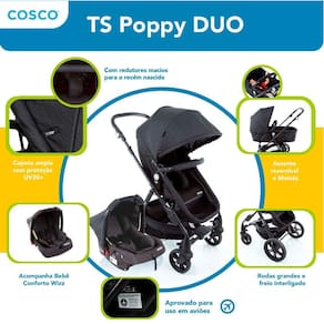 Conjunto de bebê conforto Wizz com o carrinho Poppy. Possui assento moisés reversível. Ambos com proteção solar UV30+. Bebê conforto certificado para uso em aviões.