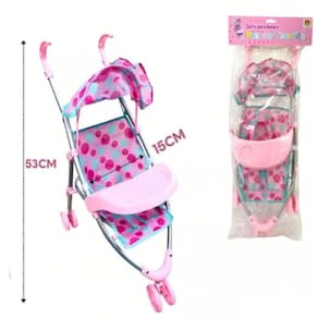 Carrinho para boneca para dar passeios super divertidos! Ele é no modelo 3 rodas, tem uma estampa linda e é dobrável, facilitando o transporte para qualquer lugar.