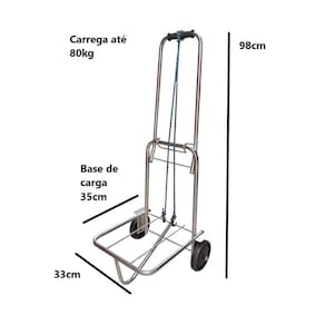 Carrinho de carga aço cromado dobrável 80kg com elástico carrinho de carga em aço cromado dobrável 80kg Carrinho para carregar as suas cargas, feito com aço Suporta até 80kg. Vai com corda para amarração. Pegador para as mãos. Rodas de plástico. Medidas aberto: - Altura: 98cm. - Largura: 33cm. - Profundidade: 35cm. Medidas fechado: - Altura: 60cm. - Largura: 39cm. - Profundidade: 20cm. Base de carga: - Largura: 33cm. - Profundidade: 35cm. Peso: 2,60 kg. Com de fábrica. Marca: Não Informado Ean: 300384124393