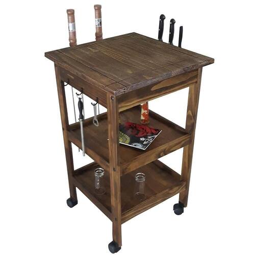 Super funcional, possui suportes para espeto, talheres e facas, com prateleiras para acomodar os utensílios domésticos organizadamente e rodízios para auxiliar na locomoção e tornar tudo mais fácil. Proporciona mais espaço no preparo das refeições, seja para a cozinha, um espaço gourmet ou área de lazer, é muito convidativo e com certeza dará um up em sua decoração!