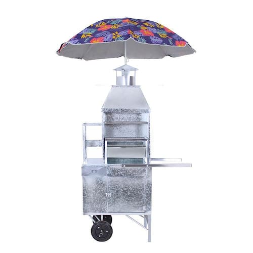 Esse carrinho conta com prateleira para expor bebidas e molhos e sua estrutura é feita com a parte superior inteira em aço galvanizado e inferior em chapa branca com pintura epóxi sendo suas 2 rodas maciças além de acompanhar um guarda-sol para proteção contra sol ou chuva.