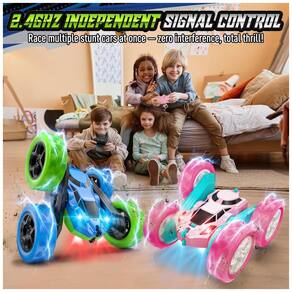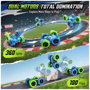 Carrinho de controle remoto Hamdol 360° Stunt Car, desenvolvido para crianças a partir de 6 anos, com carroceria em plástico ABS resistente a impactos e design em duas cores que permite condução em ambos os lados após capotagens. A tração 4WD e o sistema de rotação possibilitam giros de 360°, flips, rolamentos e outras manobras contínuas em ambientes internos e externos planos.??