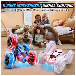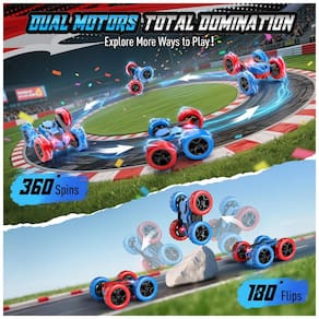 Carrinho de controle remoto Hamdol Red & Blue, desenvolvido para crianças a partir de 6 anos, com carroceria em plástico ABS resistente a impactos e design dupla face em vermelho e azul que permite condução em ambos os lados após capotagens. A tração 4WD e o sistema de rotação possibilitam giros de 360°, flips e manobras contínuas em ambientes internos e externos planos, contribuindo para o desenvolvimento de coordenação motora e percepção espacial.??