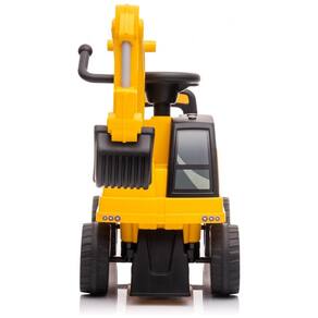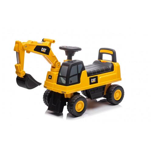 Carrinho de empurrar infantil Best Ride On Cars escavadeira CAT, licenciado oficialmente, com estrutura em plástico resistente, assento com encosto e formato de escavadeira para uso com impulso dos pés. O modelo incorpora pá frontal funcional acionada manualmente, permitindo simular escavação e movimentação de materiais durante a brincadeira.?