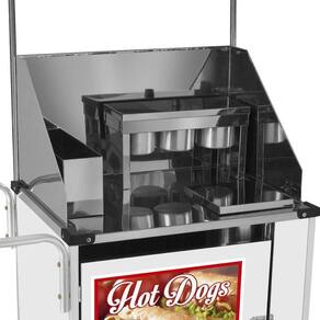 Esse Carrinho de Hot Dog é fabricado com estrutura em aço carbono e chapa de aço pintada de branco, o modelo simples possui 3 canecas pequenas e 1 grande aonde é possível colocar diversos tipos de molhos e recheios fazendo a inovação do seu Cachorro Quente. Acompanha um exclusivo adesivo e toldo para dias ensolados e chuvosos.