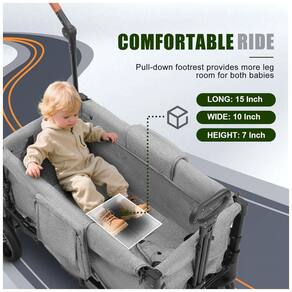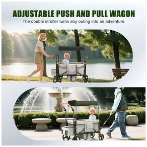 Ficha Técnica • Dimensões do produto (desdobrado): 112 x 57 x 83 cm (C x L x A)? • Peso do produto: 12,7 kg? • Capacidade máxima de peso: 90,7 kg (total); até 15 kg por assento? • Peso da embalagem: 13 kg • Capacidade: 2 crianças ou equivalente em carga até 90,7 kg? • Materiais: Estrutura e alças em alumínio; rodas pneumáticas todo terreno? • Faixa etária: Bebês e crianças unisex? • Conteúdo da caixa: Carrinho completo, cobertura, barra de puxar, barra de empurrar, estrutura? • Manual do usuário: Inglês (idioma principal) Marca: Não Informado