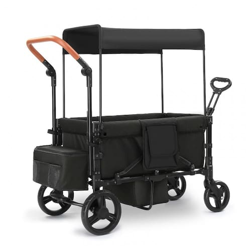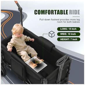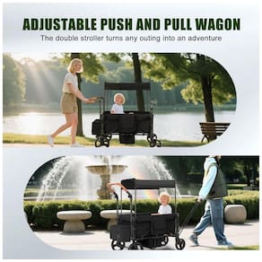 Carrinho de passeio dupla SAFETY CAREYA preto funciona em 3 modos: empurrar, puxar ou dobrável, com poço retrátil para pés e capacidade total de 90,7 kg para uso outdoor em acampamentos, parques ou passeios. Estrutura leve em alumínio de 12,7 kg com alças telescópicas ajustáveis facilita manobras em diferentes alturas, rodas todo terreno com absorção de choque para variados solos. Cobertura ajustável em posições múltiplas adapta-se à luz solar. Inclui organizador com bolsos para lanches, fraldas e garrafas. Assentos com acolchoamento espesso e cinto de 5 pontos com proteção contra liberação acidental. Freio de um passo para parada segura; dobra em três etapas para armazenamento compacto (57 x 42 x 89 cm). Certificado ASTM para segurança; montagem requerida com instruções simples. Compatível com bebês e crianças. Dimensões desdobrado 112 x 57 x 84 cm suportam uso versátil em exteriores.