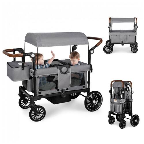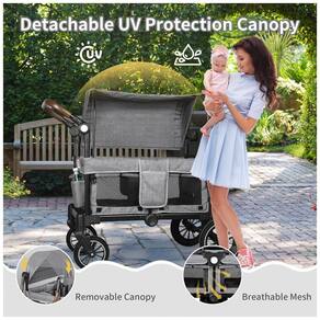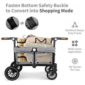 Carrinho de passeio dupla Todecare cinza oferece estrutura para dois assentos infantis, com capacidade máxima de 50 kg e conversão em carrinho de compras ou transporte de pets ao remover as almofadas. Projetado para uso outdoor em compras, acampamentos ou passeios na praia, conta com rodas de PU de alto impacto, suspensão por molas e freio nos rodas traseiras para adaptação a diferentes terrenos. A cobertura removível ajustável em ângulos varia conforme a posição solar e permite lavagem em máquina. A alça de empurrar/puxar ajustável acomoda diferentes alturas de adultos, com bandeja destacável incluindo dois suportes para copos. Espaço interno ventilado por quatro janelas em tela, com área antiderrapante para pés e almofadas elevadas para estabilidade. Tecidos removíveis laváveis, incluindo capas e alças em couro sintético para manuseio. Estrutura em metal reforçado com cinto de segurança de três pontos e tecido envolvente para proteção contra impactos. Rodas dianteiras com giro de 360 graus facilitam manobras; dobra compacta para armazenamento em porta-malas de veículos padrão. Inclui organizador para pais com compartimentos laterais, bolsos e suportes adicionais. Compatível com crianças em idade de uso de carrinhos; montagem requerida com instruções mínimas.