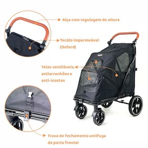 Especificações: * Manual de instrução em português; * Dimensões do produto aberto (altura x largura x comprimento): 110 x 58 x 90 cm; * Dimensões do produto fechado (altura x largura x comprimento): 48 x 58 x 95 cm; * Dimensões do berço (altura x largura x comprimento): 64 x 45 x 70 cm; * Duas rodas frontais de 7" com pneus EVA; * Duas rodas traseiras de 11" com pneus EVA; * Tecido impermeável (Oxford); * Alça revestida com couro sintético; * Peso do carrinho é de 11 kg; * Para pets até 35 Kg; * Ideal para cachorros e gatos; * Modelo Pet foi um Buldogue Inglês de 34 kg.