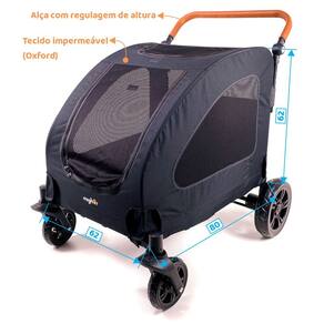 Especificações: * Acompanha manual de instrução; * Dimensões do produto aberto (altura x largura x comprimento): 109 x 81 x 98 cm; * Dimensões do produto desmontado (altura x largura x comprimento): 29 x 69 x 90 cm; * Dimensões do berço (altura x largura x comprimento): 62 x 62 x 80 cm; * Duas rodas frontais de 7,5" com pneus EVA; * Duas rodas traseiras de 11" com pneus EVA; * Peso do carrinho é de 11,2 kg; * Para pets até 55 Kg; * Ideal para cachorros e gatos; * Modelo Pet foi um Golden Retriever de 35 kg.