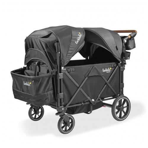 O Larktale Caravan Quad é um carrinho de passeio tipo wagon com 4 assentos, indicado para crianças a partir de 6 meses, com estrutura metálica e tecido de poliéster para uso urbanizado, parque e praia. Os assentos são reclináveis em múltiplas posições, com banco de apoio para pés removível que permite postura mais natural, além de sistema de arnês de 5 pontos “no-rethread” que facilita ajuste sem desfazer o cinto, podendo acomodar uma ou duas crianças por lado conforme o modelo de uso. O carrinho opera como empurrado manualmente, com rodas de grande diâmetro de borracha e suspensão em todas as rodas, proporcionando grande estabilidade em calçadas, parques e áreas de lazer.