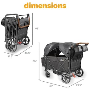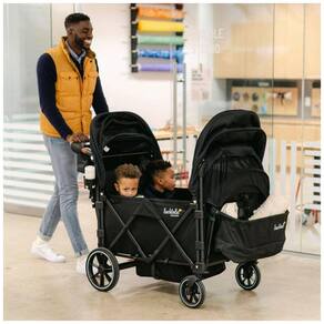 Conteúdo da caixa: Carrinho wagon quad montado, assentos reclináveis, arnês de 5 pontos no-rethread, capota solar dupla, raincover, raincover deluxe, cesto de armazenamento, console de parentais com suporte de copo, capa de apoio de pés, clasp de liberação de pés, kit de montagem básica