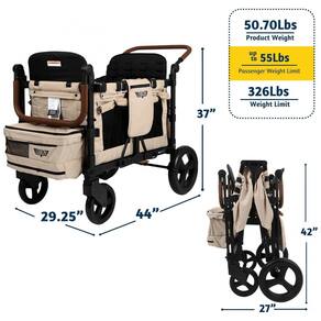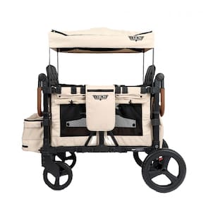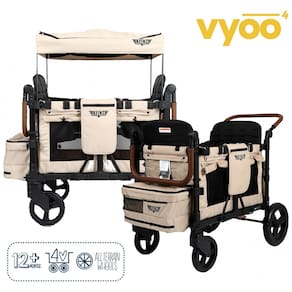 Carrinho de passeio quadrúplo Keenz VYOO marrom acomoda 4 crianças em 5 posições versáteis (frente a frente, costas com costas, voltadas para fora), com suspensão em 4 rodas para mobilidade todo terreno em calçadas, trilhas ou parques. Estrutura em alumínio com rodas em borracha garante estabilidade em paisagens variadas. Segurança por cintos ajustáveis de 5 pontos duplos e freio de pé. Cobertura em poliéster 100% com painéis blackout e proteção SPF. Armazenamento inclui compartimento ventilado para sapatos, bandeja para lanches com 2 suportes para copos, bolsos zipados externos e espaço sob assentos. Interior acolchoado em poliéster para conforto. Dobra para 74 x 64 x 107 cm facilitando guarda. Capacidade máxima 148 kg; certificado JPMA, sem compatibilidade com cadeirinhas de carro. Indicado para toddlers; limpeza de tecidos por método suave; montagem por instruções.