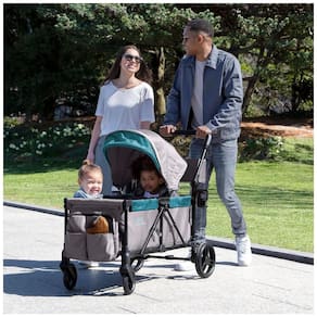 A estrutura durável e resistente à ferrugem deste vagão, os pneus à prova de furos e a dobra compacta facilitam a arrumação ou o transporte. O vagão comporta até 49,89 quilos no total e é recomendado para idades de 9 meses até 24,94 quilos. Ele também é compatível com os seguintes assentos de carro Graco SnugRide Click Connect 30, 35, 40, Evenflo Nurture, Evenflo Embrace, Britax B-Safe 35, Chicco KeyFit 30 (adaptador de assento de carro A1961001 vendido separadamente).