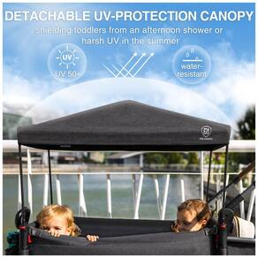 O carrinho é projetado com a segurança das crianças em mente, apresentando um cinto de segurança de 5 pontos integrado e dois assentos face a face, suportando até 49 kg (24 kg por assento). Os freios de pé em cada roda oferecem controle total de rotação de 360° e movimento linear, enquanto a capota UPF 50+ protege a pele sensível dos raios nocivos do sol.