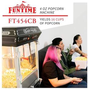 A máquina Funtime apresenta uma chaleira de óleo quente em aço inoxidável com um sistema de agitação integrado e uma tampa articulada para que a pipoca saia enquanto estoura. Além disso, possui um coletor de kernel removível que separa os grãos não estourados da pipoca. Com um design fácil de limpar, é construída para estourar grandes quantidades de pipoca estilo teatro A chaleira tem capacidade de 0,14 gramas e aquece rapidamente, dispersando o calor uniformemente para maximizar a quantidade de grãos estourados. O conjunto de tampa de movimento livre permite que o milho estourado saia facilmente da chaleira por conta própria. Com dimensões de 49,53 cm x 43,18 cm x 86,36 cm, possui painéis laterais de vidro temperado de segurança, construção totalmente em metal de qualidade, luz aquecedora embutida e compartimento de armazenamento prático na base do carrinho.