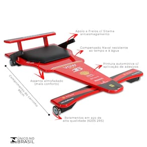 Material: Compensado Naval, Madeira, Rolamentos, Parafusos, Espuma e Courino Dimensões: Altura: 21 cm, Comprimento: 99 cm, Largura: 45 cm Idade Sugerida: A partir de 6 anos até adulto Peso Suportado: Até 150 kg Garantia: 90 dias contra defeitos de fabricação
