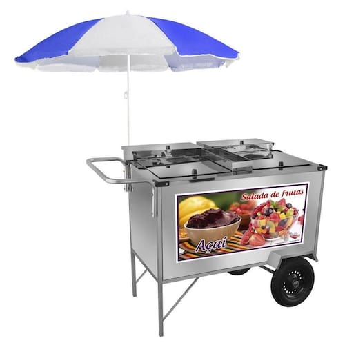 Ótima opção para quem quer empreender, o Carrinho de Salada De Frutas e Açaí Luxo Rodas Pneumáticas e Guarda-Sol, é um produto de excelente qualidade, de fácil manuseio e limpeza e muito prático.
