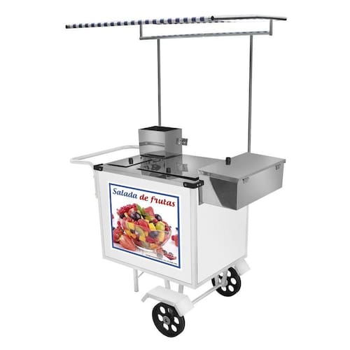 Ótima opção para quem quer empreender, o Carrinho de Salada de Fruta Luxo com Rodas Maciças e Toldo, é um produto de excelente qualidade, de fácil manuseio e limpeza e muito prático.