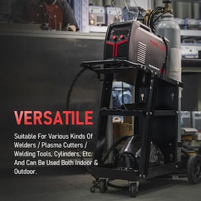 YESWELDER Carrinho de solda para soldador TIG MIG e cortador de plasma, mesa inclinável grande armazenamento 360° carrinho de solda rolante - Aplicação versátil: adequado para vários tipos de soldadores/cortadores de plasma/ferramentas de soldagem e assim por diante. Pode ser utilizado tanto em ambientes internos quanto externos. Com forte capacidade de carga de 118 kg, cabe na maioria das máquinas YESWELDER - Armazenamento grande em 3 camadas: o espaço é grande o suficiente para acomodar um grande número de itens de soldagem, como soldador, cortador de plasma, ímãs de soldagem, alicates, capacete de soldagem, tocha TIG, avental, luvas, etc. - RODAS PESADAS: Equipadas com 2 rodas universais + 2 rodas traseiras resistentes, permitem o movimento em todas as direções suavemente sem oscilação ou ruído. - Plataforma inclinada: a bancada inclinada na primeira camada permite que você opere melhor o painel da máquina e leia os dados. - Correntes de segurança: Duas correntes resistentes de 70 cm para manter o cilindro no lugar com segurança e resistência.