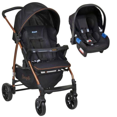 Carrinho Ecco Preto Cobre com Bebê Conforto e Base Burigotto- Carrinho de Bebê Ecco 0 a 15kg - BurigottoPassear com o bebê é uma delícia. Além de ser um momento divertido para o pequeno que começa a descobrir o mundo ao seu redor, os papais também aproveitam vendo a felicidade do filho. No entanto, carregar a criança sempre no colo acaba sendo cansativo e desconfortável, por isso, o ideal é ter um bom carrinho de bebê como o modelo Ecco da Burigotto. Características do Produto: - Capota regulável e removível.- Cinto de segurança de 5 pontos.- Protetor frontal.- Rodas dianteiras com giratórios.- Freio traseiro conjugado.- Cesto porta-objetos.- Encosto reclinável em 4 posições.- Trava para fixação da cadeira Touring X Vendido separadamente Imagens meramente ilustrativas. As cores podem variar entre as imagens mostradas acima e o produto. Medidas do Produto Aberto:Peso: 8 kgAltura: 110 cmLargura: 56 cm Comprimento: 90 cmMedidas do Produto Fechado:Altura: 98 cmLargura: 56 cm Comprimento: 38 cm- Bebê Conforto Touring X - BurigottoGrupo 0+ para crianças até 13kg- Protetor para a cabeça removível.-Capota removível.-Regulagem do cinto na altura dos ombros.-Alça de apoio e para transporte.- Cinto de segurança de 3 pontos.- Protetor acolchoado para os ombros.- Estrutura em plástico de engenharia, leve e resistente- Concha arredondada para balanço- Base Ref.: IXAP0351 - vendida separadamente . Prática e segura, pode permanecer instalada no veículo, facilitando encaixar e retirar a cadeira.A base é fechada na parte inferior. Medida do Produto: Peso: 2,8 kgAltura: 58 cmLargura: 46 cmComprimento: 65 cm- Conjunto contém: 1 Carrinho de Bebê Ecco 0 a 15kg - Burigotto1 Bebê Conforto Touring X - Burigotto- Base vendida separadamente Medidas da Embalagem:Peso: 14 kgAltura: 90 cmLargura: 55 cmComprimento: 55 cmHomologação Inmetro: CE-BRI/IQB 002276 52415/18-041