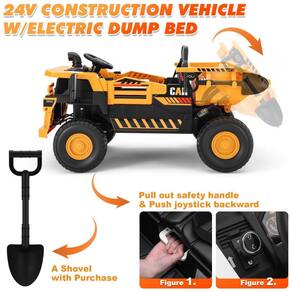 Possui caçamba basculante elétrica funcional para simulação de carga, compartimento para acessórios e pá-brinquedo, painel Bluetooth integrado com reprodução de músicas, interface USB e comando de áudio via botões no volante. Controle remoto parental de 2,4GHz com três velocidades e ajuste de direção (frente/reverso) permite supervisão total do deslocamento. Os dois assentos de 20 polegadas contam com cintos de segurança de três pontos e travas em portas laterais. Iluminação LED frontal, buzina, histórias/músicas temáticas e estrutura principal em polipropileno + metal garantem durabilidade e aprovação ASTM F963-23.