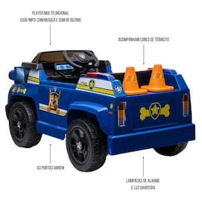 Carrinho Elétrico Infantil Brinquedo Resgate Patrulha Canina Chase Carro Motorizado Policia 12V Controle Usb Luz Sons Carro Policia Patrulha Canina 12 V - Azul Especificações Técnicas: - Recomendado Para crianças à partir de 03 anos ou com peso máximo de até 30Kg idade recomendada pode variar dependendo do tamanho da criança, verifique sempre as medidas do produto e o peso máximo permitido - Direção 2 em 1, pode ser controlado tanto a distância pelo controle remoto, como manualmente pela criança de dentro do veículo. - Recomendado somente 1 criança por vez. - Bateria recarregável de 12V - Tempo de carregamento: de 8 a 12 horas - Duração da bateria: de 40 min à 1 hora - Velocidade máxima: 5 km/h - Cinto de segurança de dois pontos com regulador - Peso Aproximado do Produto: 16Kg - Medidas do produto Aproximadas : 106 cm comp. X 66 cm larg. X 56cm alt. - Medidas da Embalagem Aproximadas : 130 cm comp. x 58 cm larg . X 30 cm alt. - Material das Rodas e Assento: Plástico resistente- Fabricante: Bangtoys Perguntas Respondidas: - Tem Ré Sim- Luz de Led no farol dianteiro e traseiro Dianteiro e em cima parte traseira- Acionamento da buzina e som do motor no volante Sim - Tem rádio Tem Entrada para MP3 Tem USB Tem música Sim- As portas abrem Tem trava de segurança nas portas Sim- Tem chave Não- Luz no painel Sim Botão e Radio - Voltímetro digital que marca o percentual de uso da bateria Não- Botão para aumentar/diminuir o volume Sim- Botão de Liga/Desliga que emite ronco do motor Sim- Pedal para que a criança possa acelerar Sim Conteúdo da Embalagem: - 01 Carro Elétrico Infantil - 01 Carregador Bivolt 110V/220V - 01 Controle Remoto funciona com 2 pilhas AAA Não Incluídas Homologação Inmetro: ABCP-BRI-0260-2021-02