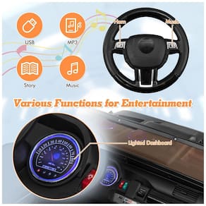 Possui assento duplo de 20" (50 cm) com cintos de segurança de 3 pontos, adequado para até 2 crianças (3 a 8 anos) ou uma criança maior, respeitando o limite máximo de 50 kg. Inclui controle remoto (2,4Ghz) para supervisão parental, com 3 velocidades, função de frenagem instantânea e modo de controle total. O painel multimídia entrega som via MP3, USB, modo rádio, conexão auxiliar e botões interativos no volante (buzina e música).