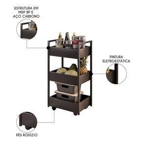 Com estilo industrial, ele não só serve como um elemento decorativo moderno, mas também como um organizador eficiente com rodinhas que facilitam a movimentação. Ideal para ser utilizado na Cozinha como um Carrinho Auxiliar, para colocar temperos e utensílios, ou em Área Gourmet e espaços com churrasqueira, para todos os itens necessários para entretenimento e lazer em família. Com bandejas que suportam os itens de forma segura e acessível. As rodinhas são um diferencial que aumentam a mobilidade do carrinho, permitindo que ele seja facilmente deslocado de um lugar para outro. Ele pode ser utilizado de inúmeras maneiras, desde um suporte para bebidas e aperitivos durante um evento, até como um espaço extra de armazenamento em um escritório ou ateliê. A capacidade de se adaptar a diferentes funções faz dele uma escolha inteligente para quem busca otimizar espaços sem abrir mão do estilo e da praticidade.