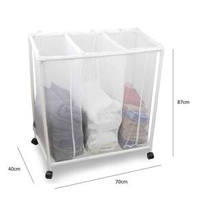 Três divisórias espaçosas: Facilita a separação das roupas para a lavagem, tornando o processo mais eficiente. Cestos em tecido resistente: Material leve, durável e fácil de manusear. Estrutura reforçada: Confeccionado em aço para maior estabilidade e resistência. Mobilidade garantida: Rodinhas que permitem transportar o carrinho com facilidade entre os cômodos. Design moderno: Perfeito para qualquer lavanderia, combinando funcionalidade e estética.