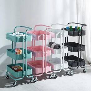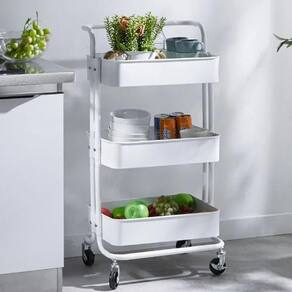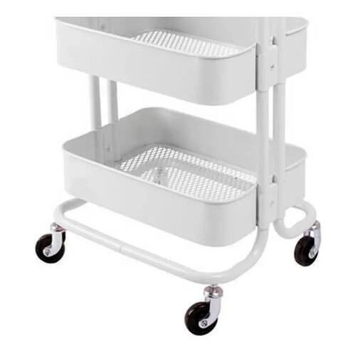 Carrinho Multiuso Organizadora 3 Prateleiras Em Aço Cor: Branco O carrinho multiuso com pintura epóxi resistente em aço 5 cores: preto, branco, turquesa, cinza e Rosa possui 3 prateleiras com bordas e fundo de superfície vazada que suportam até 10kg cada prateleira. Seu fundo possui micro furos que eliminam eventuais resíduos líquidos. O carrinho possui alça e rodízios, se tornando prático para locomoção e decorativo em seu ambiente. Ideal para diversos ambientes e para seu negócio como: sala, banheiro, quarto, lavanderia, bar, quarto de criança, salão de beleza, oficina e escritório. Basta montar e começar a organizar.