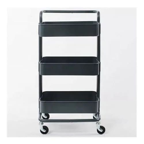 Carrinho Multiuso Organizadora 3 Prateleiras Em Aço Cor: Preto O carrinho multiuso com pintura epóxi resistente em aço 5 cores: preto, branco, turquesa, cinza e Rosa possui 3 prateleiras com bordas e fundo de superfície vazada que suportam até 10kg cada prateleira. Seu fundo possui micro furos que eliminam eventuais resíduos líquidos. O carrinho possui alça e rodízios, se tornando prático para locomoção e decorativo em seu ambiente. Ideal para diversos ambientes e para seu negócio como: sala, banheiro, quarto, lavanderia, bar, quarto de criança, salão de beleza, oficina e escritório. Basta montar e começar a organizar.