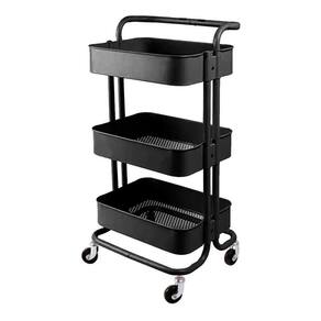 Carrinho Multiuso Organizadora 3 Prateleiras Em Aço Cor: Preto O carrinho multiuso com pintura epóxi resistente em aço 5 cores: preto, branco, turquesa, cinza e Rosa possui 3 prateleiras com bordas e fundo de superfície vazada que suportam até 10kg cada prateleira. Seu fundo possui micro furos que eliminam eventuais resíduos líquidos. O carrinho possui alça e rodízios, se tornando prático para locomoção e decorativo em seu ambiente. Ideal para diversos ambientes e para seu negócio como: sala, banheiro, quarto, lavanderia, bar, quarto de criança, salão de beleza, oficina e escritório. Basta montar e começar a organizar.