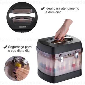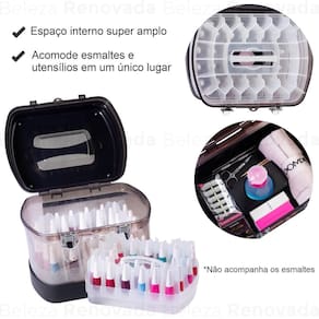 Fabricado em polímero injetado de alta resistência, conta com dois nichos destinados ao armazenamento de esmaltes. A tampa possui encaixe para cadeado e travas em aço, oferecendo maior segurança aos itens armazenados. O modelo dispõe ainda de alça para transporte e compartimento interno com capacidade para acomodar até 68 esmaltes. Acompanha suporte para acetona de 150 ml.