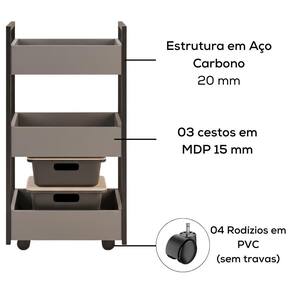 Carrinho Multiuso Lais, ideal para auxiliar na cozinha, lavanderia ou em qualquer ambiente que precise de apoio extra! Produzido em 100% MDP de 15 mm com acabamento em BP. Sua estrutura é confeccionada em aço carbono, conta com 3 cestos ideais para armazenamento de frutas, legumes e utensílios no dia a dia. Além de rodízios em PVC, permitindo fácil movimentação e praticidade na limpeza. Produto será entregue em 01 volume.